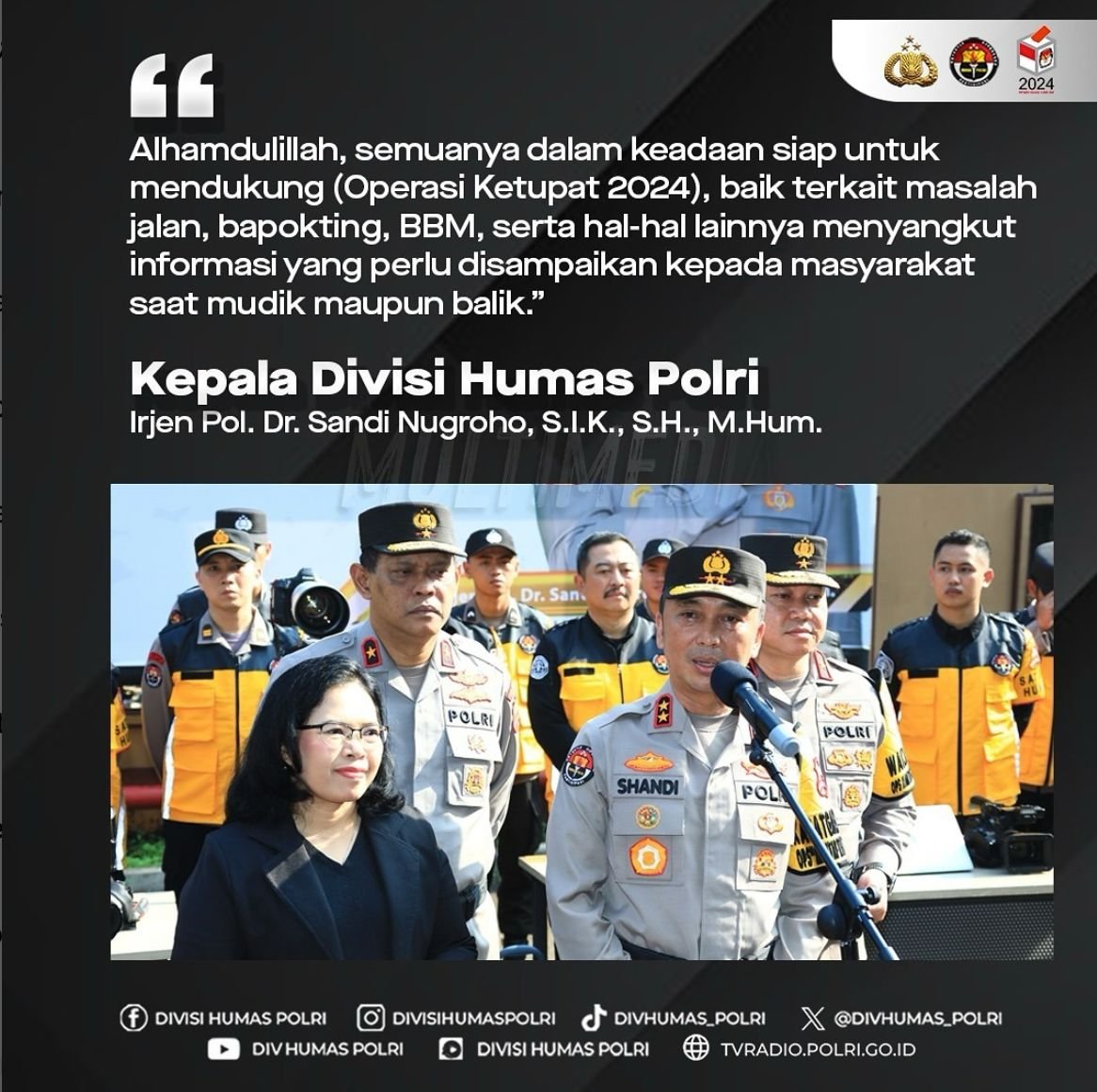Polri bersama instansi terkait siap mengawal dan mengamankan Operasi Ketupat 2024 dalam menciptakan suasana mudik-balik dan Lebaran 2024 yang aman, nyaman, tertib, dan ceria. Hal tersebut disampaikan Kadiv Humas Polri, Irjen Pol. Dr. Sandi Nugroho, S.I.K., S.H., M.Hum., usai memimpin Apel Kesiapan Divhumas Polri dalam rangka mendukung Operasi Kepolisian Terpusat Ketupat 2024 di lapangan apel Divhumas Polri, Jakarta Selatan, Senin (1/4). Tetap Nyaman Berhari Raya #siaplebaran2024